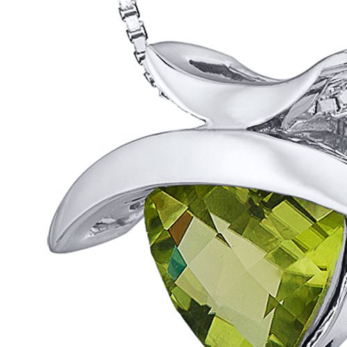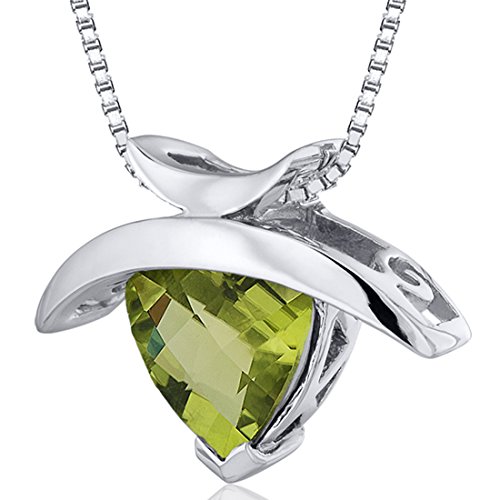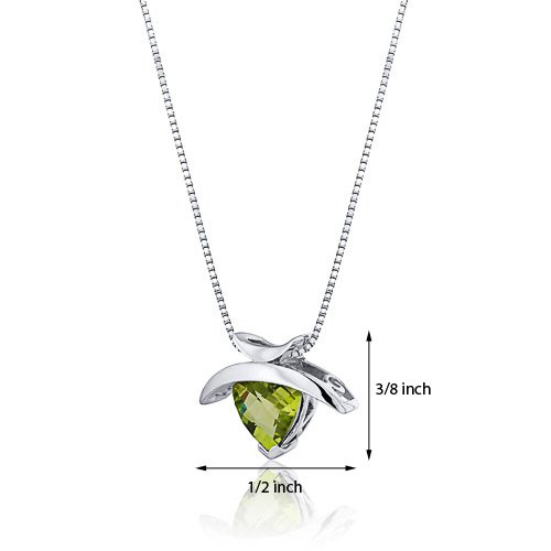 Center Stone: Genuine Peridot, Trillion Cut with Checkerboard Top, 6 mm, 0.75 carats, Leaf Green Hue with Brilliant Sparkle. Pendant: 1.00 grams, Pure Sterling Silver Rhodium Finish with .925 stamp, Pendant features intricate side detail, exceptional Design, Craftsmanship and Rhodium Finishing. Perfect gift for Mothers Day, Birthdays, Valentines Day, Graduation, Christmas or just about any other occasion. Money Back Guarantee. Includes an 18 inch Sterling Silver Rhodium Finish Box Chain, Signature Gift Box, style SP10348