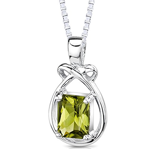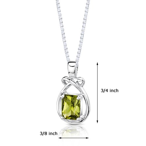 Radiant Shape 1.50 carat Peridot Pendant in Sterling Silver Rhodium Nickel Finish 1.50 carat total weight Gemstone. Peridot: 1 piece, Radiant Shape, 8×6 mm. Gemstone has a nice color. Pendant measures 3/8 x 7/8 inches and weighs 1.86 grams. Retails for $79.99 Pendant features top quality workmanship and a beautiful finish. Pendant is in pure Sterling Silver and stamped .925, comes with a 18 inch Sterling Silver Box Chain. Includes 100% Money Back Guarantee, Necklace Box
