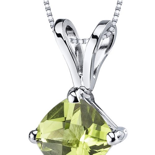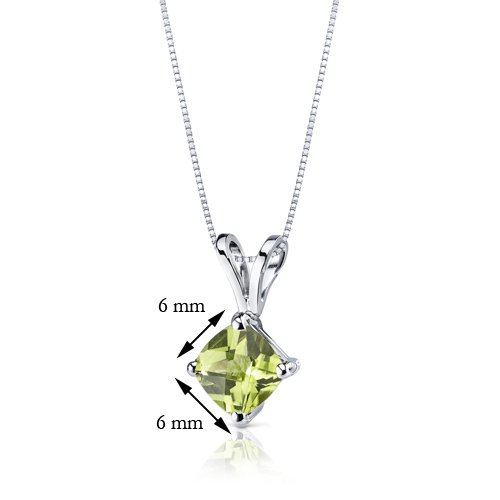 Gemstone: Genuine Peridot, Cushion Cut, 6 mm, 0.88 carats, Rich Leaf Green Hue with Brilliant Sparkle. Pendant: 0.56 grams pure 14k White Gold with 14k stamp. Pendant feature exceptional Design, Craftsmanship and finishing. Perfect gift for Mothers Day, Birthdays, Valentines Day, Graduation, Christmas or just about any other occasion. Money Back Guarantee. Includes a Signature Gift Box. Includes matching 18 inch Sterling Silver Rhodium Finish Box Style Chain. Style P9144