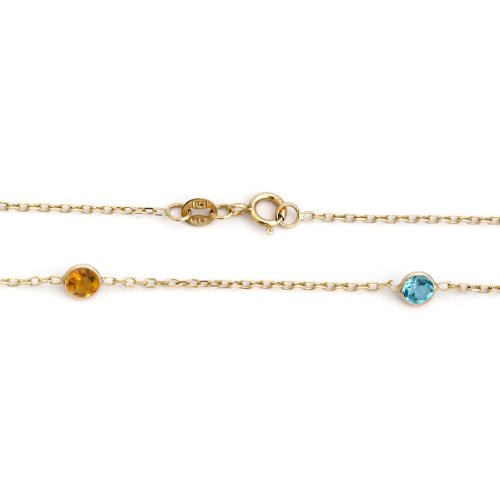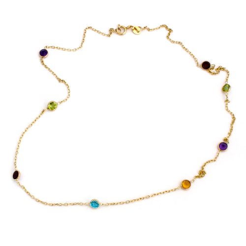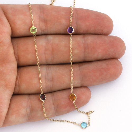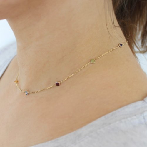 Necklace set with natural round brilliant-cut gemstones: red garnet, green peridot, purple amethyst, blue topaz, citrine.