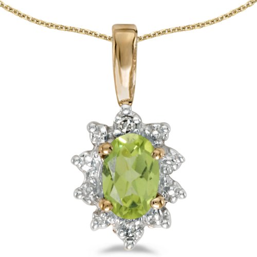 This 14k yellow gold oval peridot and diamond pendant features a 6×4 mm genuine natural peridot with a 0.40 ct total weight. 18″ 14 Karat Gold Chain Included.