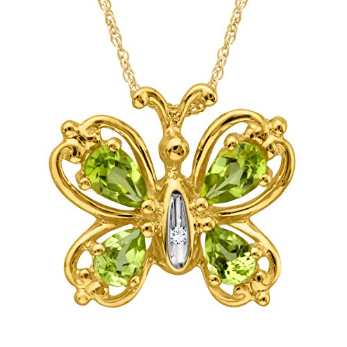 This whimsical pendant is a simple way to leap into spring. A charming butterfly with wings of colorful peridot is set in gleaming 10K gold punctuated with a bright diamond accent. Piece measures 1/2 by 5/8 inches. Comes with a 10K gold 18-inch rope chain.