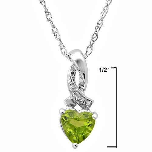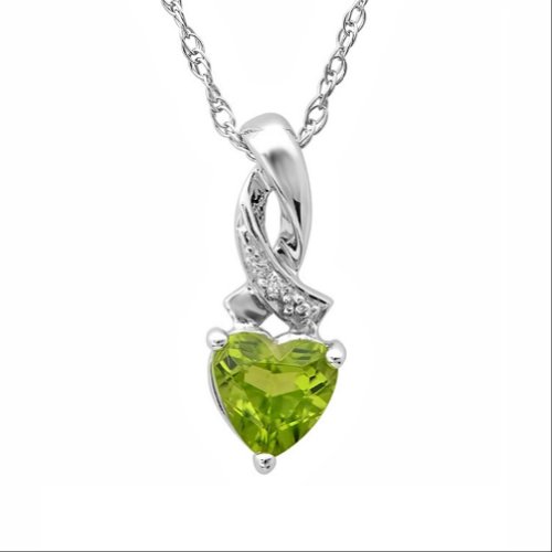 6mm heart shape peridot and 1 genuine diamond, set in sterling silver on an 18 inch sterling silver chain.