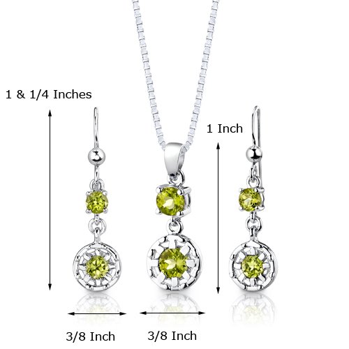 Earrings = Genuine Peridot, 2 pieces, Round shape, 4.00mm, Genuine Peridot, 2 pieces, Round shape , 4.00mm. Earring Dimensions: 1 1/4 x 3/8 inches. Pendant = Genuine Peridot, 1 piece, Round shape, 5.00mm. Genuine Peridot, 1 piece, Round shape, 5.00mm. Pendant Dimensions: 1 x 3/8 inches. Earrings and Pendant have a total weight of 4.80 grams and are set in pure Sterling Silver Rhodium Nickel Finish with .925 stamp. Gemstones have a vibrant rich color and eye clean clarity. The Pendant and Earrings feature top quality workmanship and a beautiful finish. Includes Free 18 inch Sterling Silver Rhodium Nickel Finish Box Style Chain, Free Ribbon Gift Box.