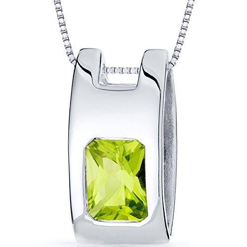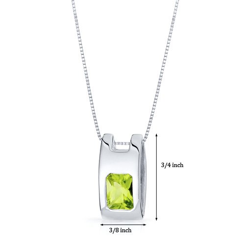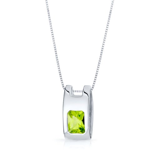 Center Stone: Genuine Peridot, Radiant Cut, 8 x 6 mm, 1.50 carats, Leaf Green Hue with Brilliant Sparkle. Pendant: 2.90 grams, Pure Sterling Silver with .925 stamp, Pendant features exceptional Design and Craftsmanship. Perfect gift for Mothers Day, Birthdays, Valentines Day, Graduation, Christmas or just about any other occasion. Money Back Guarantee. Incldues a 18 inch Sterling Silver Box Style Chain, Signature Gift Box & style SP9922